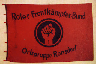 Nel lento costruirsi di un’iconografia legata al pugno chiuso, dunque, si sommano la riproduzione di un gesto spontaneo e “naturale” con una tradizione simbolica legata alla lotta politica e sociale; ma probabilmente sarà solo la sua trasformazione in saluto militare a codificare definitivamente il saluto a pugno chiuso come gesto di lotta. In un primo tempo, tra il 1923 e il 1924, esso verrà usato in questo modo dalla Rotfrontkämpferbund, una organizzazione paramilitare del Partito Comunista Tedesco che, riproducendolo sulle bandiere, ne farà anche il proprio emblema in contrapposizione al saluto romano adottato dai nazisti. La RFKB è un’organizzazione paramilitare del Partito Comunista Tedesco (KPD) nata dalle ceneri delle Proletarischen Hudertschaften (Centurie Proletarie), che dopo il fallito tentativo rivoluzionario comunista, il cosidetto “Ottobre tedesco” (1923), vengono proibite in tutto il territorio della Repubblica di Weimar. Dunque è tra la fine del 1923 e l’inizio del 1924 che nasce il pugno chiuso come saluto militante. I combattenti del RFB si salutavano con il braccio destro ripiegato verso il fianco e il pugno piegato come fosse pronto a sferrare un colpo. Il saluto nel volgere di poco tempo si modifica e attorno al 1925 il pugno destro viene sollevato all’altezza della spalla con il gomito piegato. Il saluto comunista si estende dai membri della RFKB ai semplici militanti, verrà ulteriormente modificato nel periodo del Fronte Popolare in Francia e della Guerra di Spagna con il pugno destro che viene portato all’altezza delle tempia. Il pugno chiuso diventa anche il simbolo delle Brigate Internazionali dei volontari che combattono contro il generale Franco. Nell’ottobre del 1936, infatti, la Gazzetta Ufficiale del ministero della Difesa prescriverà che il saluto militare venga fatto alzando «il pugno chiuso all’altezza della visiera, quando non si portino armi, e se si è armati, il pugno chiuso con il braccio ad angolo retto».