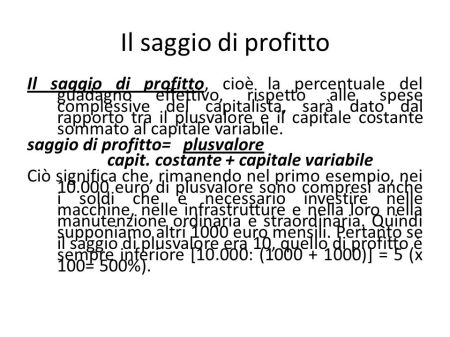 Il saggio di profitto misura il ritorno sul capitale investito in un dato periodo ed è solitamente espresso come una percentuale. Così, se un investimento di capitale di 100.000 euro circola in un anno e il profitto è 20.000 euro, allora il saggio di profitto è 20.000/100.000, ossia il 20 per cento l’anno.