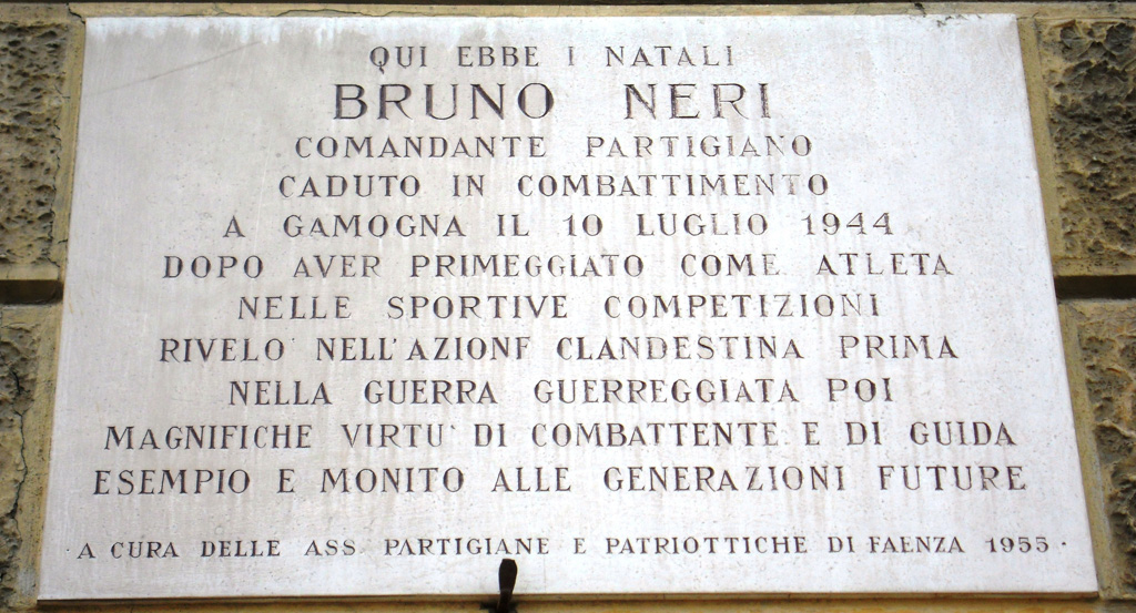 Nel 1946 il consiglio comunale di Faenza gli intitolò lo stadio, ma negli anni la memoria del calciatore-partigiano non è andata perduta. Così recita la lapide, dedicatagli nel 1955 dalla sua città natale, Faenza: Bruno Neri comandante partigiano caduto in combattimento a Gamogna