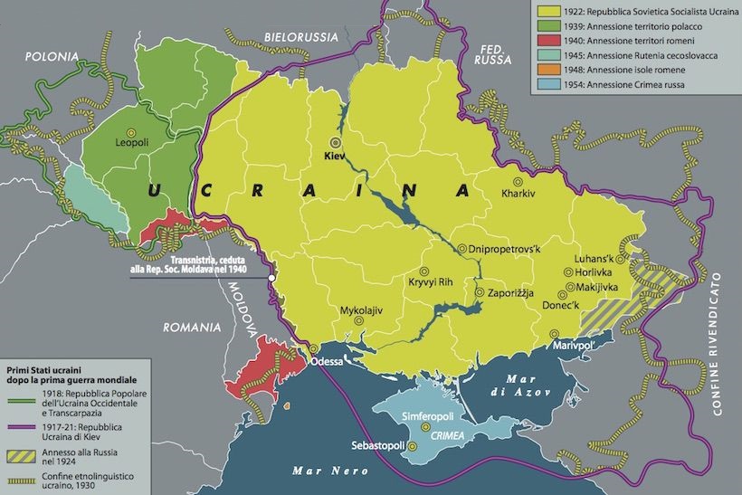 Con la nascita dell’Urss venne costituita nel 1922 la Repubblica socialista sovietica ucraina (verde chiaro). Seguirono varie annessioni territoriali: dalla Polonia (verde scuro), dalla Romania (rosso e arancione), dalla Cecoslovacchia (azzurro chiaro).