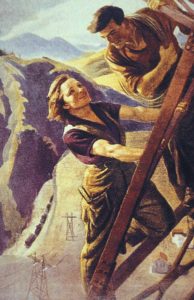Il dipinto “Vse Vyse” dell’artista avanguardista Serafima Ryangina vede protagonista una giovane coppia operaia socialista, nel momento lavorativo. Sono in alto, parecchi metri dal terreno, su un traliccio elettrico, sorridenti e illuminati dal sole, entrambi si guardano con intensità e fierezza. Dinamismo, tecnologia, meccanicismo sono i veri colori dell’opera, chiara celebrazione del progresso dell’URSS del piano quinquennale. E’ la fluttuazione tra l’essere del presente e l’essere del futuro della produzione collettiva.